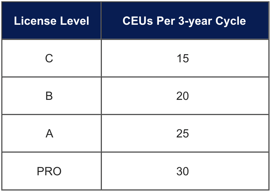 • A license needs to be renewed every three (3) years and to renew, a certain number of CEUs must be acquired within the 3-year period (before the expiration date)