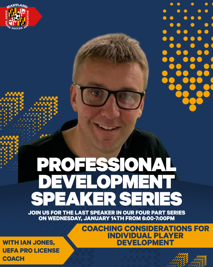Join MSYSA for the last session of our four-part Professional Development Speaker Series on Wednesday, January 14th, from 6:00 to 7:00 PM! We are excited to welcome Ian Jones, UEFA Pro Licensed Coach as our speaker. He will be presenting on Coaching Considerations for Individual Player Development.